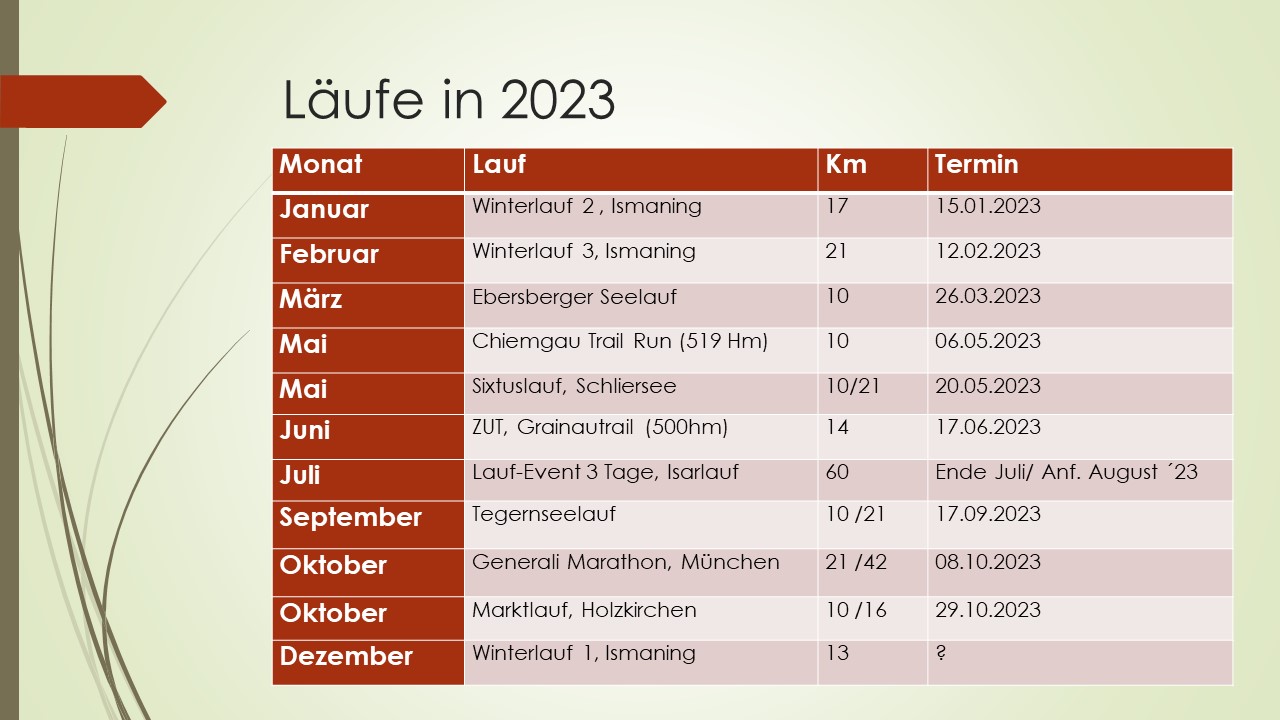 Auch im Jahr 2025 wollen wir wieder gemeinsam an Laufveranstaltungen teilnehmen und Spaß und Freude beim Laufen in einer anderen Umgebung haben. Dabei können wir den Zusammenhalt in unserer Laufgruppe weiter steigern und gemeinsam Erfolgserlebnisse genießen. Wir schlagen nachfolgende Laufwettbewerbe vor, die wir gemeinsam besuchen wollen. Dabei haben wir eine gleichmäßige Verteilung übers Jahr genauso berücksichtigt, wie verschiedene Laufdistanzen und der Möglichkeit, gemeinsam mit der Nordic Walking - Gruppe unterwegs zu sein.
